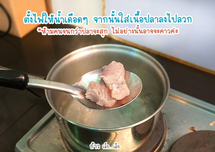 2. ต้มน้ำตั้งไฟให้เดือด จากนั้นใส่เนื้อปลาชิ้นพอดี