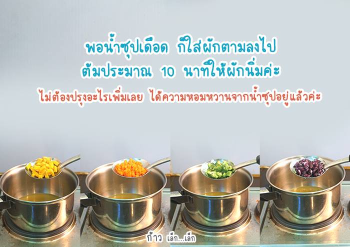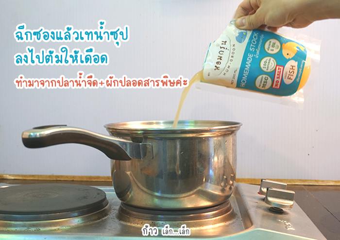 นำน้ำสต็อก “หอมกรุ่นรสปลา” (มีให้เลือกทั้งหมด 4 รส หมู,ไก่,ปลา,ผัก) ตั้งไฟให้เดือด